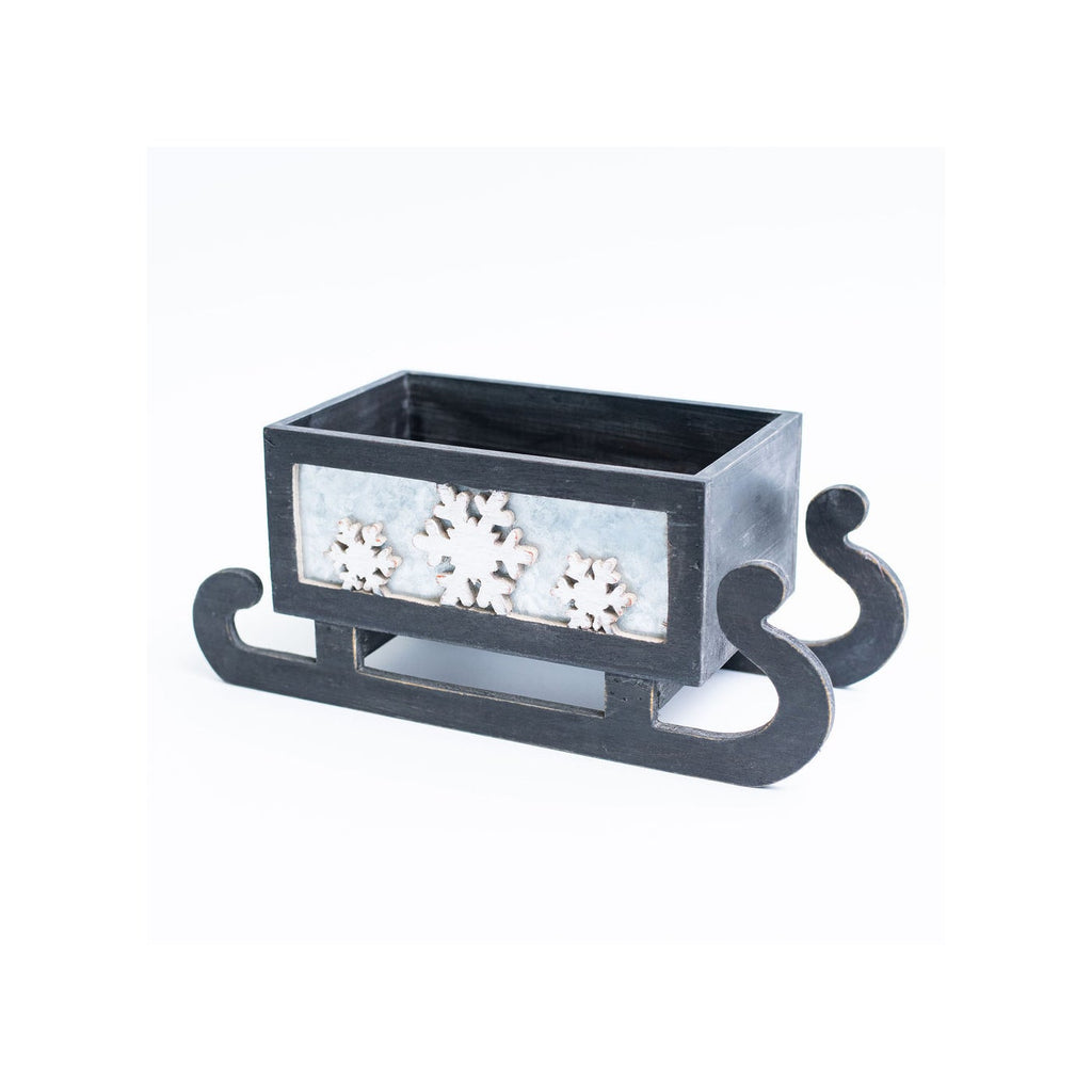 Bring festive charm to your holiday displays with this delightful Snowflake Wood Sleigh! Measuring 9.375"L x 5.75"W x 4"H, this rustic wooden container features charming snowflake details and comes complete with a protective liner. Perfect for creating eye-catching centerpieces, it's ideal for holding fresh greenery, poinsettias, or seasonal florals. The classic sleigh design adds nostalgic winter magic to mantels, tables, and entryways. A versatile holiday essential that transforms any space into a cozy winter wonderland!